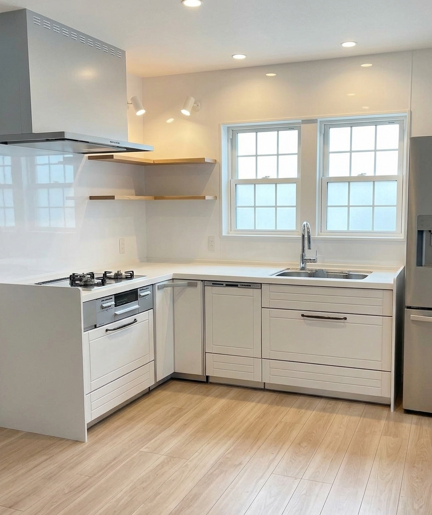 窓に向かって配置したL字キッチンは、外の景色や光を感じながら気持ちよく料理ができる設計。動線も良く作業効率に優れ、家族の気配も感じられる心地よいキッチン空間です。
